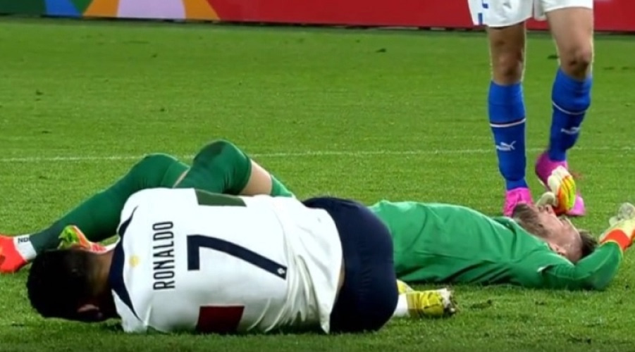 Προσωρινή διακοπή στο ματς, ο Κριστιάνο και ο Βατσλίκ στο έδαφος, με τον Πορτογάλο να έχει και το σοβαρότερο πρόβλημα όταν οι γιατροί διαπίστωσαν ότι αιμορραγούσε από τη μύτη.