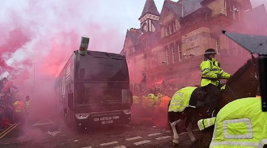 Σημαντικές φθορές, έπειτα από ρίψη αντικειμένων κατά την αποχώρηση της αποστολής από το «Άνφιλντ», υπέστη το πούλμαν της Μάντσεστερ Σίτι.