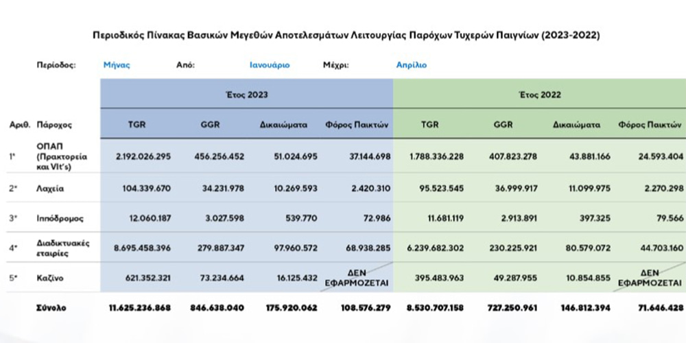 Η μόνη κατηγορία που πήγε κόντρα στις παραπάνω ήταν αυτή των λαχείων, με τα νούμερα του 2023 να είναι μικρότερα κατά 2.767.939€ σε σχέση με αυτά του 2022.