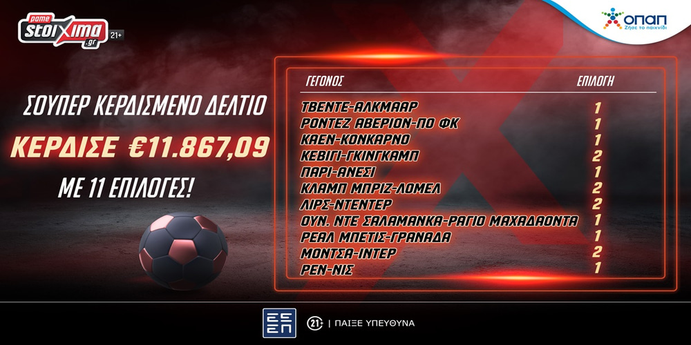 Στο Pamestoixima.gr ο μεγάλος νικητής κέρδισε €11.867,09 με €14.20, τοποθετώντας τρία δελτία, ένα με παρολί και δύο με συστήματα. Παρακάτω τα 11 παιχνίδια που επέλεξε.