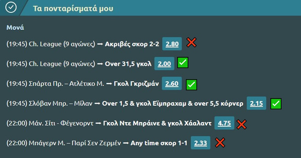 Τρία πέρασαν, τρία χάθηκαν αλλά κλείσαμε με κέρδος χθες, συν βέβαια το live με τα late γκολ σε Μάντσεστερ και Βαρκελώνη (σε απόδοση 2.56) που πέρασε - έστω και στο τέλος. Αν ξεκινούσε ο Ντε Μπράινε, ίσως έβγαινε και το 4.75 - αλλά εδώ, θα μου πείτε, σκόραρε ο Γκριζμάν κι ας μπήκε αλλαγή…
