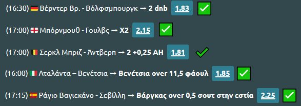 ↩️🤑 Αρκετά καλό το Σάββατο, ομολογώ, καθώς πέρασαν και οι τρεις βασικές επιλογές (το Χ2 της Γουλβς στο 2.15, το dnb της Βόλφσμπουργκ στο 1.83 και το ασιατικό της Αντβερπ στο 1.81 που πλήρωσε κατά το ήμισυ) αλλά και δύο από τα ειδικά (τα φάουλ της Βενέτσια στο 1.85 και το σουτ του Βάργκας της Σεβίλλης στο 2.25 – παρακαλώ).