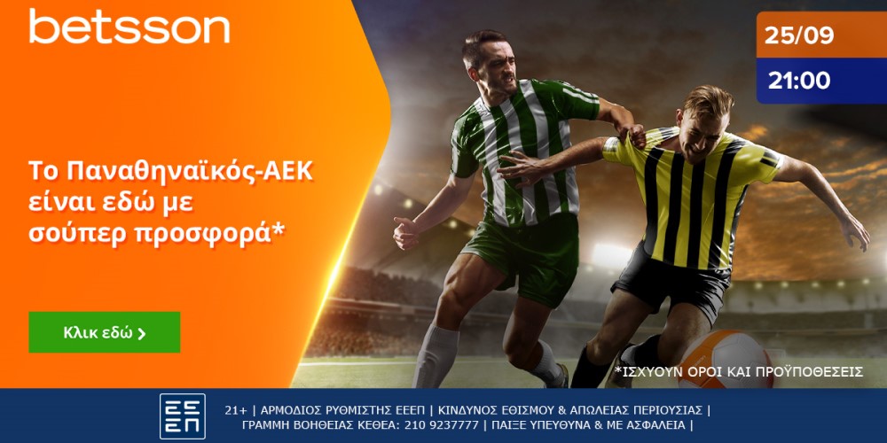 Η Super League συνεχίζει ακάθεκτη με ντέρμπι και το Παναθηναϊκός - ΑΕΚ (25/09, 21:00) παίζει στην Betsson με μία σούπερ προσφορά*.