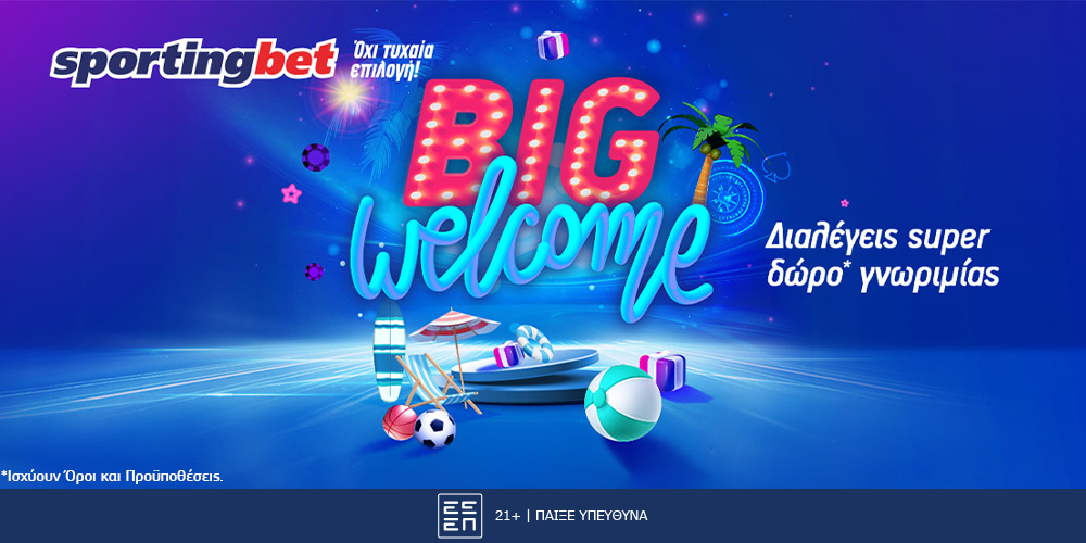 Tο Big Welcome* της Sportingbet είναι εδώ για να σε βάλει σ’ ένα μοναδικό κόσμο παιχνιδιού με ατελείωτη διασκέδαση και μοναδικά έπαθλα*! Το καλοκαίρι η διάθεση ανεβαίνει στην Sportingbet.